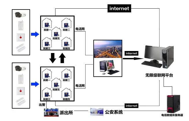 周边防范:来访者通过别墅门口机呼叫,业主确认后开门,其他非法入侵都会引起警报(别墅门口机和大门红外对射关联,开锁后撤防,上锁后,自动布防)。