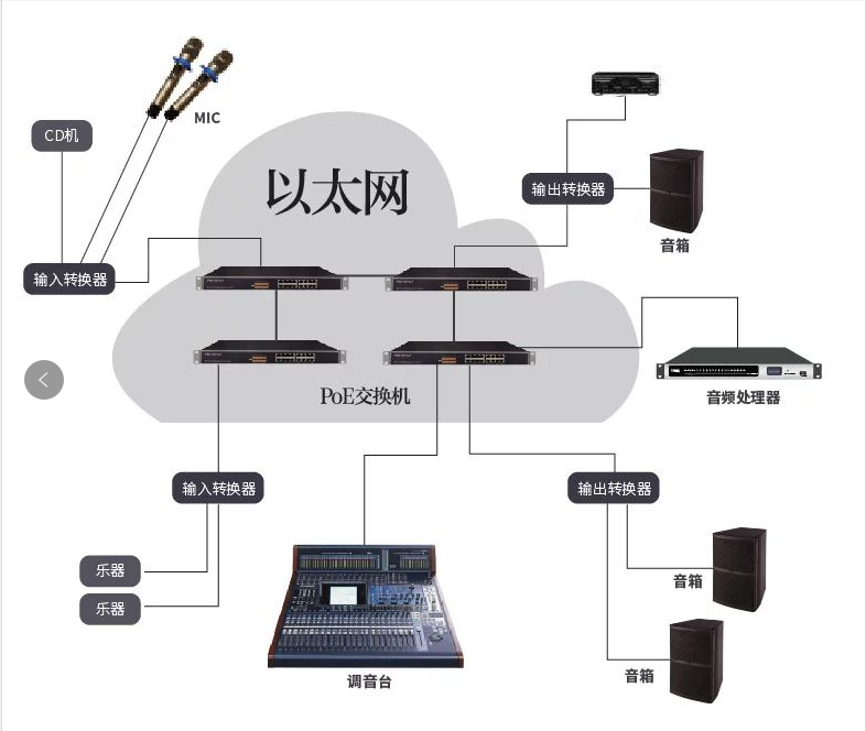 音频信号通过专用转换器转换成TCP/IP网络信号并传送到网络中,音频信号以数据包的形式在网上路由到任意的输出转换器,并转换成模拟信号提供给扬声器或者记录设备。对于一些处理设备,如数字处理器和数字混音台等,则无需数字、模拟转换,而是直接在网络环境中处理数据包,并以相同的TCP/IP数据包返回网络中供其它设备使用。