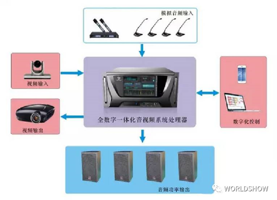 输出端可以独立完成对输出端音频的整理,包括音箱的标准化和声学环境的补偿处理、视频终端的多窗口拼接处理、传输补偿和控制系统的多种格式的控制信号的输出等等。