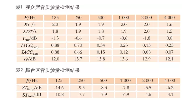 音乐厅竣工后,设计团队对音乐厅进行声学检测[3](空场状态)。厅内主要音质指标测量结果如表1所示。